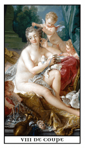 Love in Perfection Card Number: 43 Keywords: Stability, Perfection, Fullness In a Reading Harmony, Balance, Peace, Grace, the heart is full on every level. We love all people, all things, ourselves, Earth, nature, our connection with the universe is realized. Adversely, this Arcanum might represent the refusal to continue in the cycle, to become stagnant in perfection, or one’s refusal of love’s perfection. Multiple Eights in a Spread: 3 eights – possible travel. 4 eights – an important message or long awaited news. |