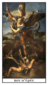 Mastery of Concepts and Ideas, The Bearer of Solutions Card Number: 34 The Archangel Micheal is victorious over Lucifer. In a Reading The King of Swords is a warm, charismatic, charming person who’s thoughts are trusted to few. He is between appreciation of the beauty of thought and the most active state of mind. He listens, learning many things – revealing nothing; someone who’s made discretion a vice. When he speaks, his words are chosen wisely. A master of concepts and ideas, he employs skillful negotiation and diplomacy, preferring to use his wit to win his objectives. He knows some battles are not worth wining, quietly walking away from untenable positions. If you ride with this King you may conquer many lands without ever having drawn a sword. Less favorably, since those represented by this Arcanum don’t give their trust easily, they are deeply offended by betrayal of their trust. A close friend or viable colleague may be regrettable lost this way. The King of Swords advises us to be adept, articulate, considerate, to use our words strategically to affect change. To let one’s mind govern one’s tongue, to listen more often than we talk, to be loyal but to walk away from dysfunction. Multiple Kings in a Spread: 3 Kings mean recognition for your accomplishments or awarded. 4 Kings indicate a meeting with someone of great importance. |