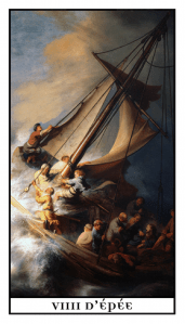 Being Ready to Leave Subjective Imprisonment Card Number: 30 The disciples, in fear for their lives, are tossed about in a raging storm on the Sea of Galilee. In an instant Christ calms the sea with a thought and the power of His will. In a Reading Traditional meanings are of a difficult, mental, anguish; of worry and anxiety that cause difficulty sleeping. Doubt, frustration, guilt, remorse and a troubled mind weigh down on like a massive, gray burden. But one must learn let go of these worries and move on from his or her self-made prison. Numerically, the 9 is in positive crisis and heading for new construction. Its time to break down walls we have built around ourselves, to stop being defensive. Its time to realize that outside views are important and time to learn to listen to others. Your ideas are only a part of the world. Multiple Nines in a Spread: 3 nines signifies the arrival of news or an important message. 4 reveal added responsibilities and obligations. |