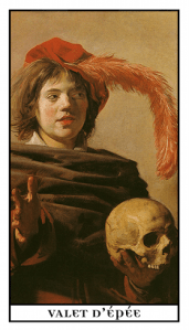 Using Your Mind, Being Truthful, Be Fair, Learn/Intellect in Flux Card Number: 32 A young, impassioned young man holds a skull. He is brilliant, good company. His conversation and thoughts are intriguing and captivating. But he’s a tiny bit unstable, and just a little dangerous. Maybe that’s why we feel a slight attraction for him. “He’s mad that trusts in the tameness of a wolf, a horses health, a boy’s love, or a whore’s oath…” – The Fool in King Lear In a Reading He can symbolize a young person or an older person with youthful characteristics who hesitates, lacking self confidence, doubting him or her self. Perhaps someone who didn’t finish an education. Like all the pages, his position requires discretion and determination. He is idealistic, maybe angry with the injustices of the world, he can be defensive, he could bite if he feels cornered. He asks us to: