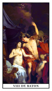 Focused Creativity, Orgasm Card Number: 71 Keywords: Perfect Performance, Intense Execution, Sexual Orgasm, Acclaim for One’s Art In a Reading Energy is reduced to only what is essential. Perfect efficiency, perfection of movement creatively and sexually are achieved. A performance is profoundly focused and the artist’s concepts truly appreciated by his audience. Sexually, orgasm is achieved. With effortless authority and no need to “own it”, there’s no longer a need for the king to wear his crown. Its a time for travel and swift but well thought action. The downside would be a temptation to stop moving forward, to stagnate in the state of perfection. Multiple Eights in a Spread: 3 Eights – possible travel. 4 Eights – an important message or long awaited news. |